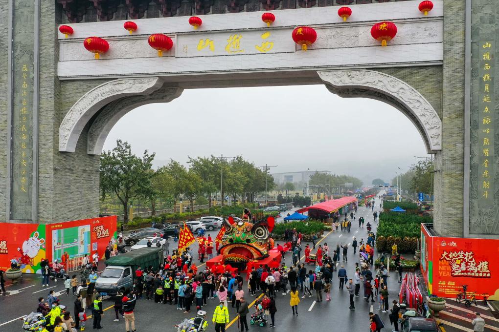 2023年1月12日,在佛山市南海區西樵鎮西樵山牌坊,人們爭相目睹高4.68米、寬4.5米的“獅王”獅頭。新華社記者 劉大偉 攝