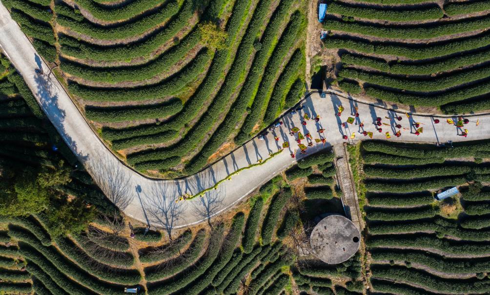 2025年3月18日,浙江省杭州市富陽區拔山村的舞龍隊在茶農和游客的簇擁下走進萬畝茶園。新華社記者 徐昱 攝