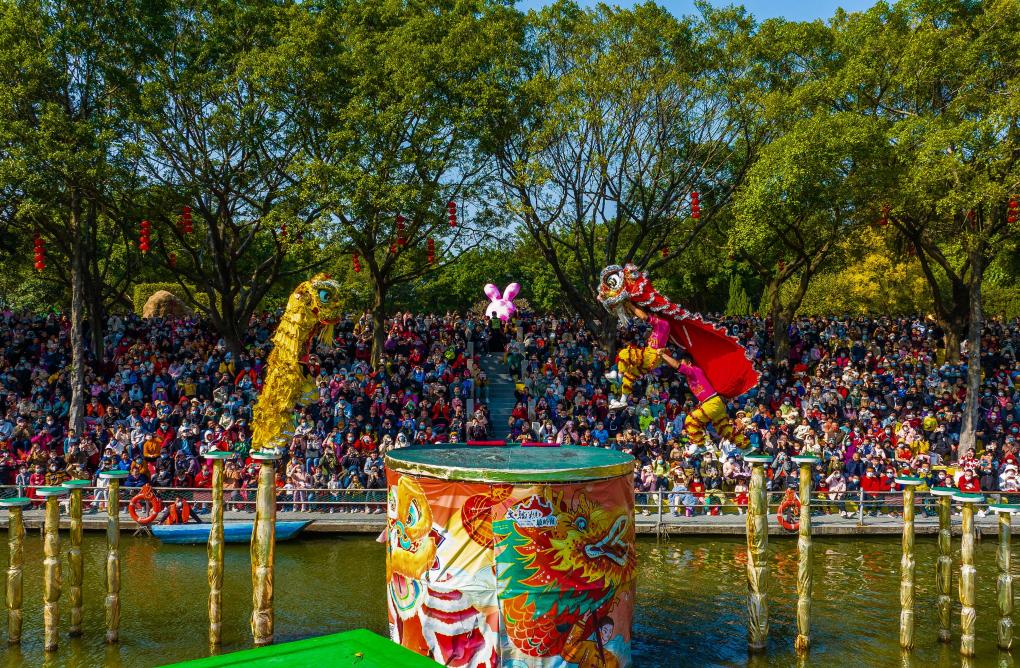 2023年1月24日,春節期間,在位於佛山市南海區西樵鎮的西樵山天湖,水上高樁醒獅表演吸引眾多游客觀賞。新華社記者 劉大偉 攝