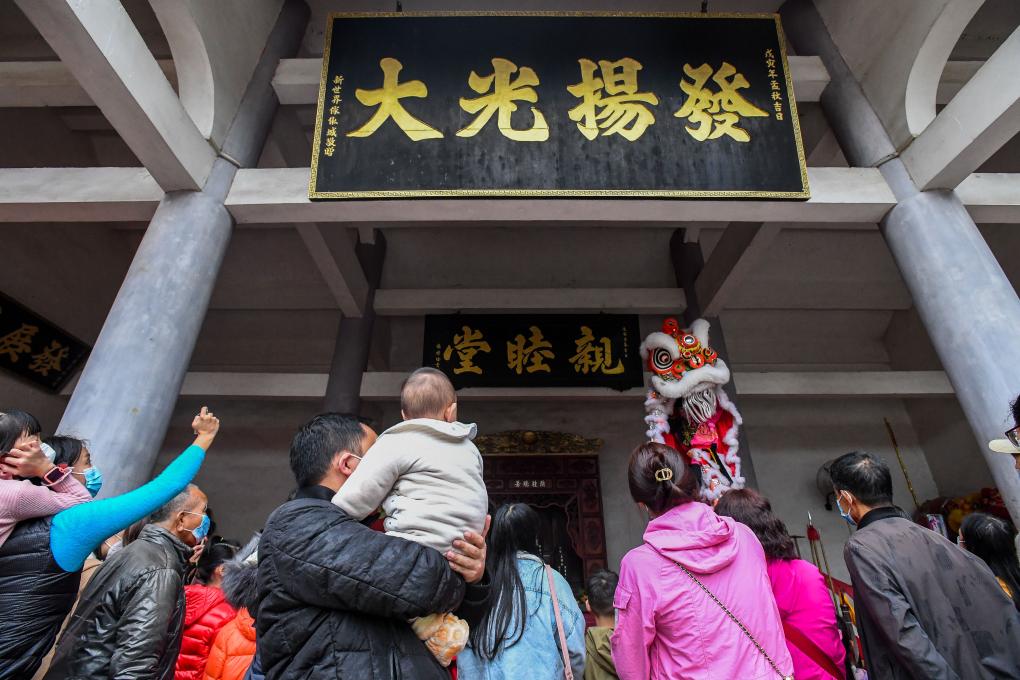 2023年1月12日,在佛山市南海區西樵黃氏宗祠,這裡現在也是黃飛鴻獅藝武術館,獅團為游客表演醒獅。新華社記者 劉大偉 攝
