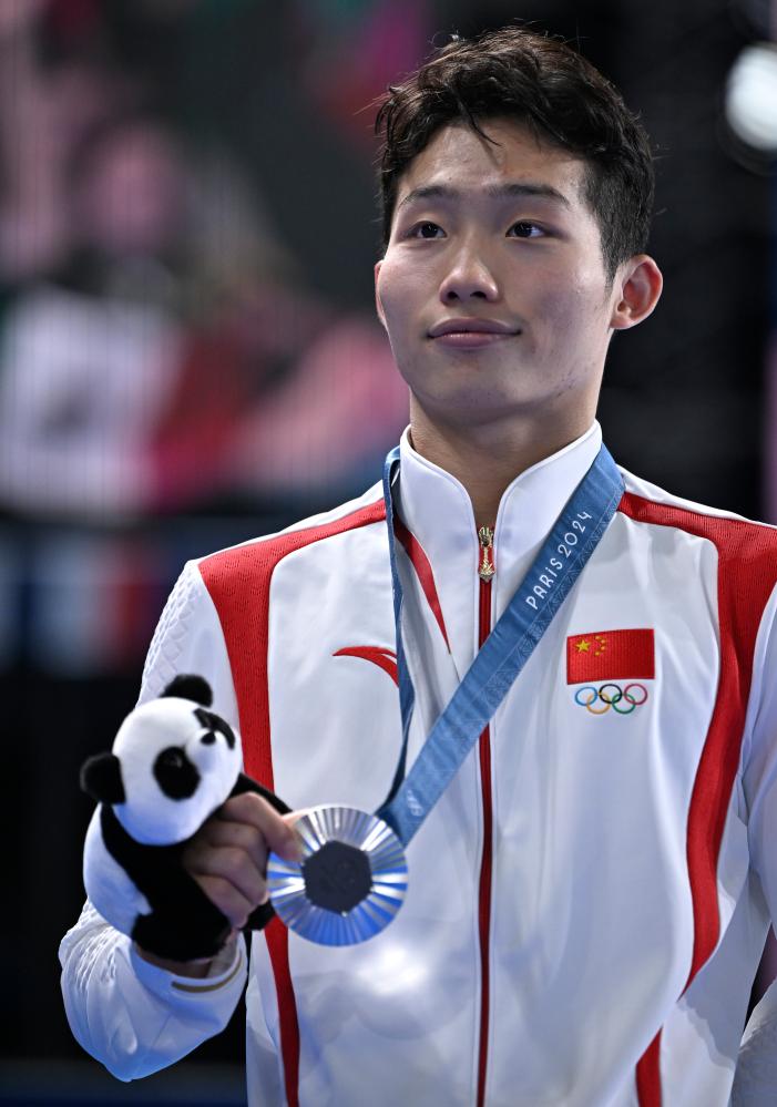 2024年8月8日,王宗源在巴黎奧運會跳水項目男子3米板決賽頒獎儀式上。新華社記者 王鵬 攝