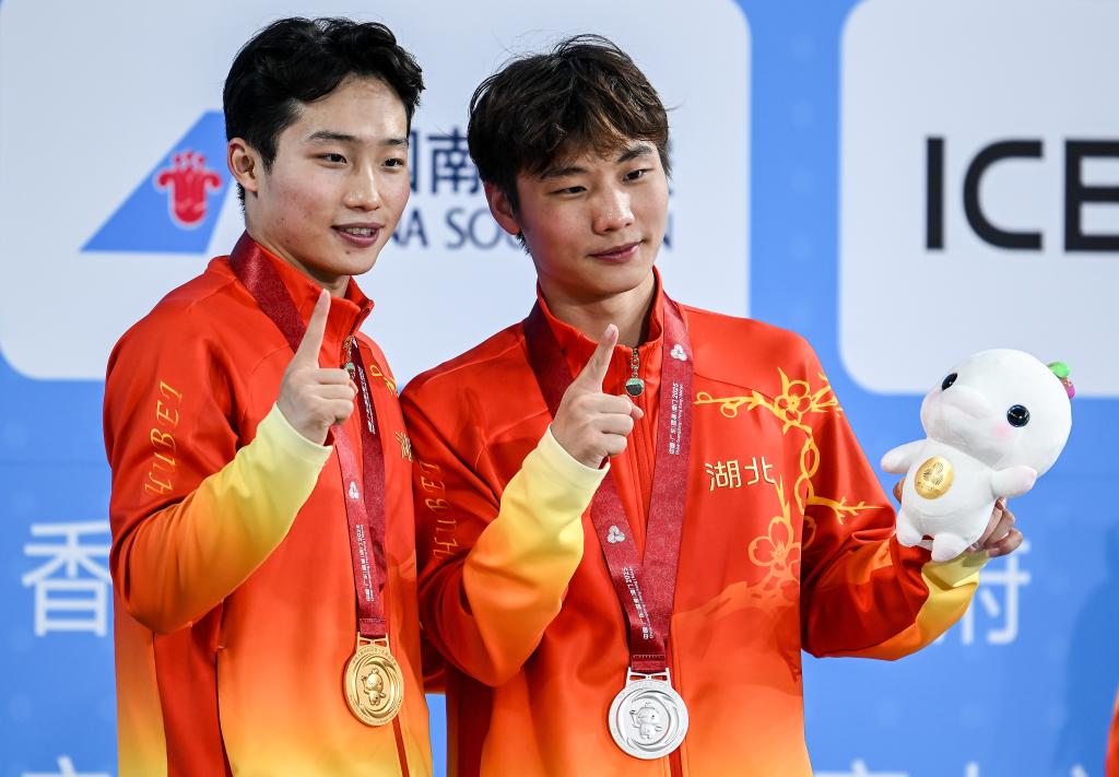11月10日,獲得冠軍的湖北隊選手王宗源(左)與獲得銀牌的隊友鄭九源在頒獎儀式上合影。新華社記者 肖藝九 攝