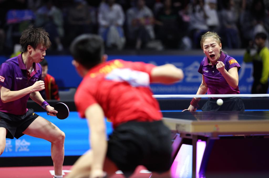 2025年11月13日,林高遠/劉詩雯(前)在第十五屆全國運動會乒乓球混合雙打半決賽中。新華社記者 梁旭 攝