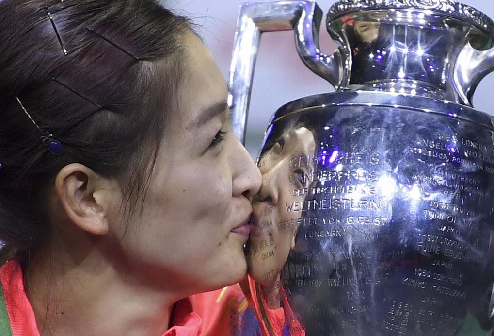 2019年4月27日,劉詩雯在匈牙利布達佩斯世乒賽女單頒獎儀式上親吻冠軍獎盃。新華社記者 逯陽 攝
