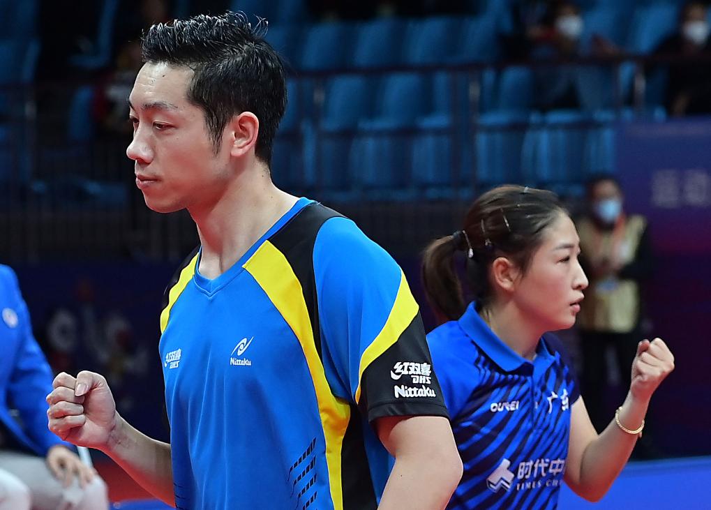 2021年9月24日,聯合隊組合許昕(左)/劉詩雯在比賽中慶祝。 當日,在陜西延安進行的第十四屆全運會乒乓球項目混合雙打決賽中,聯合隊組合許昕/劉詩雯以4比2戰勝黑龍江隊組合曹巍/王曼昱,獲得冠軍。 新華社記者 李安 攝