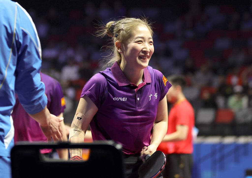 2025年11月13日,劉詩雯在第十五屆全國運動會乒乓球混合雙打半決賽後。 新華社記者 梁旭 攝