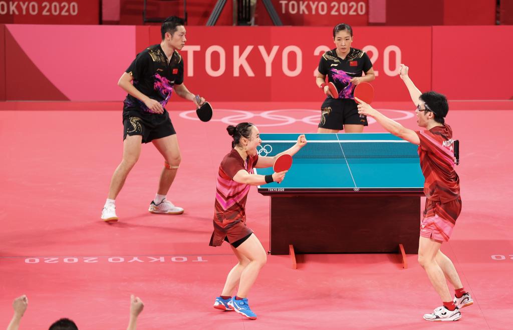 2021年7月26日,在東京奧運會乒乓球混雙決賽中,中國隊選手許昕/劉詩雯不敵日本隊選手水谷隼/伊藤美誠,獲得亞軍。新華社記者 鄭煥松 攝