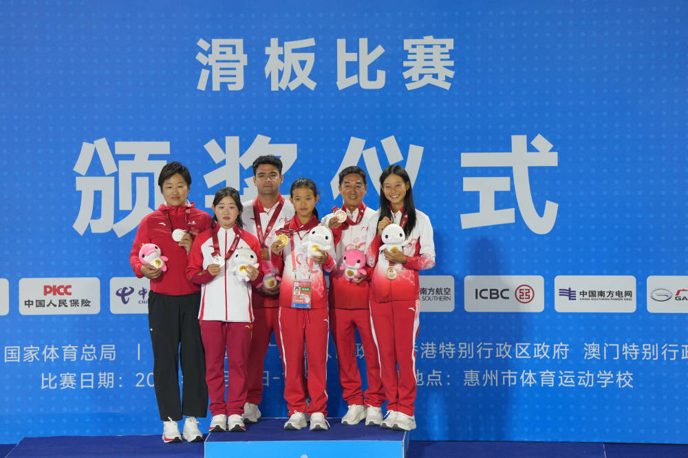 11月11日,第十五屆全國運動會滑板項目女子碗池賽決賽在廣東惠州舉行。冠軍廣東隊選手鄒明珂(右三)、亞軍山東隊選手孟令妍(左二)、季軍廣東隊選手鄭好好(右一)和教練在頒獎儀式上合影。新華社記者 劉坤 攝