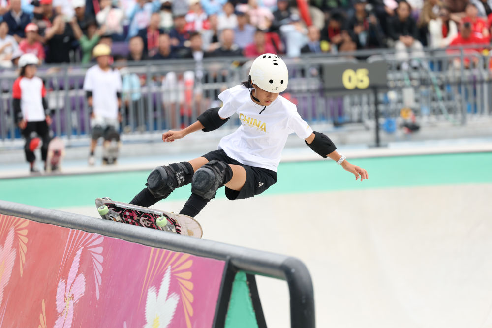 2023年11月4日,第一屆全國學生(青年)運動會滑板女子碗池決賽在廣西北海舉行,鄭好好獲得亞軍。新華社記者 胡星宇 攝