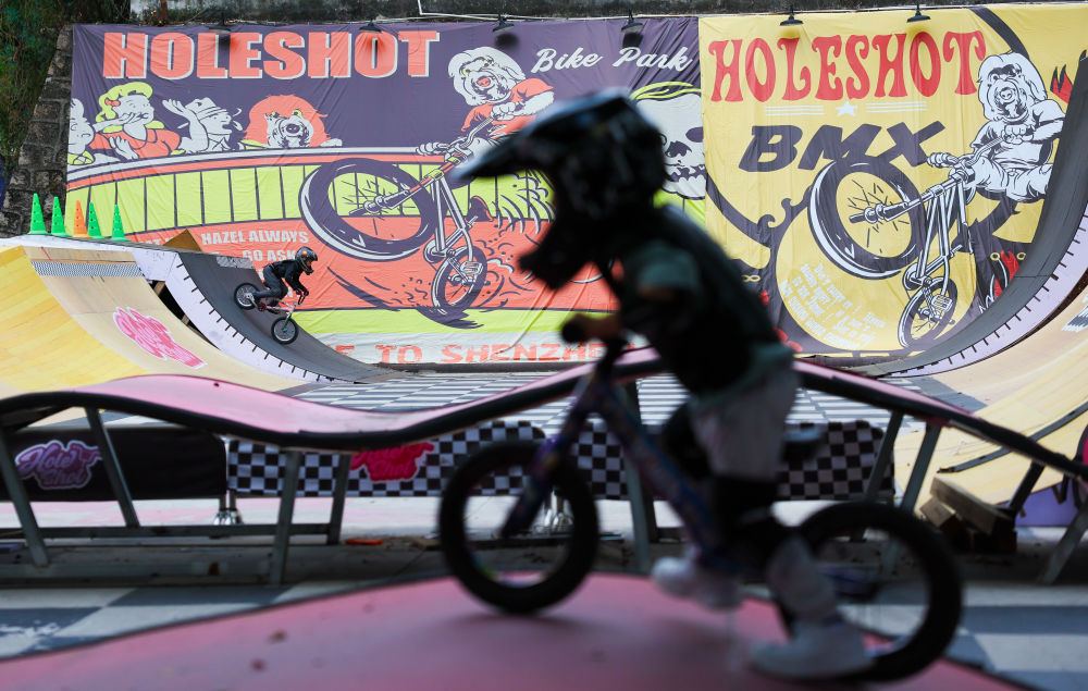 10月31日,在位於深圳福田區的HOLE SHOT騎行公園,小朋友們練習小輪車。新華社記者 胡星宇 攝