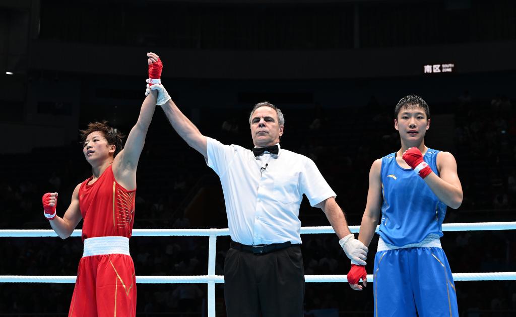 13日,在第十五屆全國運動會拳擊比賽女子50公斤級決賽後,獲勝的吳愉走下拳&,寥寥數語,鏗鏘有力。