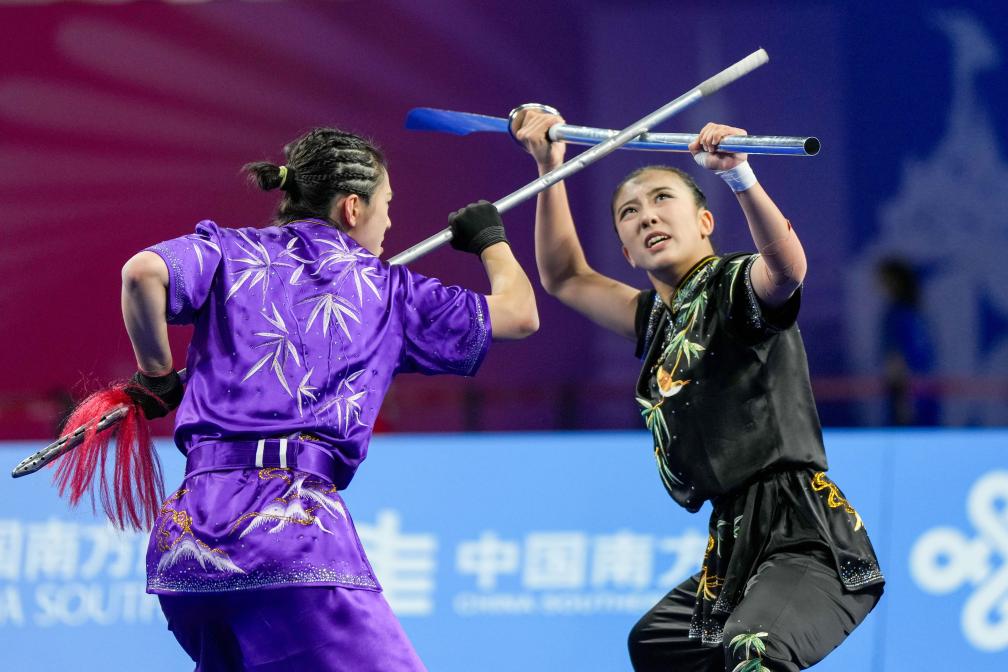 11月10日,山東隊選手孫守諾、於文珂在團體賽女子二人器械(含徒手與器械)對練比賽中。最終,山東隊奪得金牌。新華社記者 晉美多吉 攝