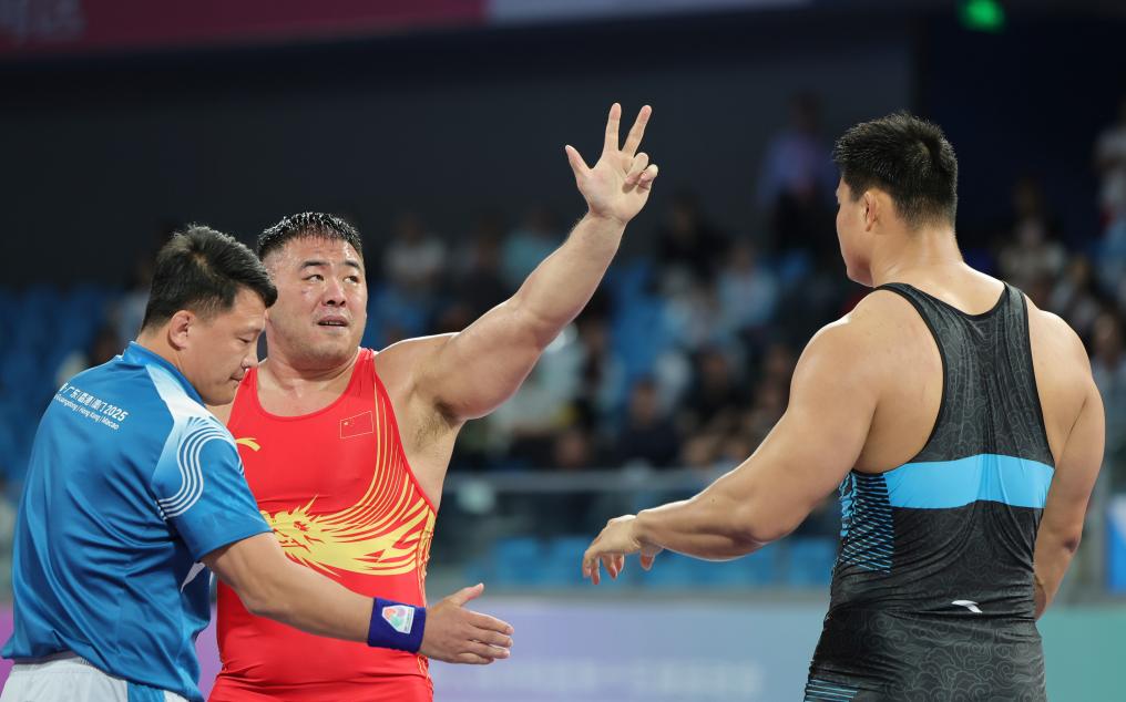 新華社廣州清遠11月13日電(記者王楚捷、胡拿雲)三連冠!12日,在第十五屆全運會男子自由式摔跤125公斤級決賽現場,37歲的鄧志偉高舉雙手,比出“3”的手勢。