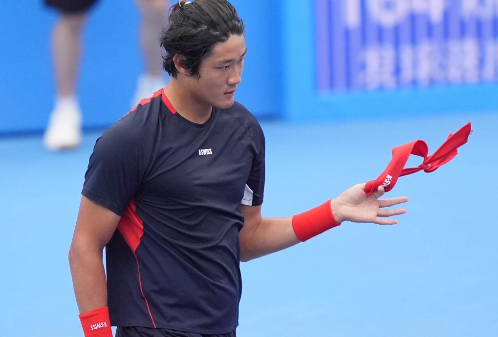 11月13日,上海隊選手張之臻在男子單打比賽結束後取下頭巾。新華社記者 顏麟蘊 攝