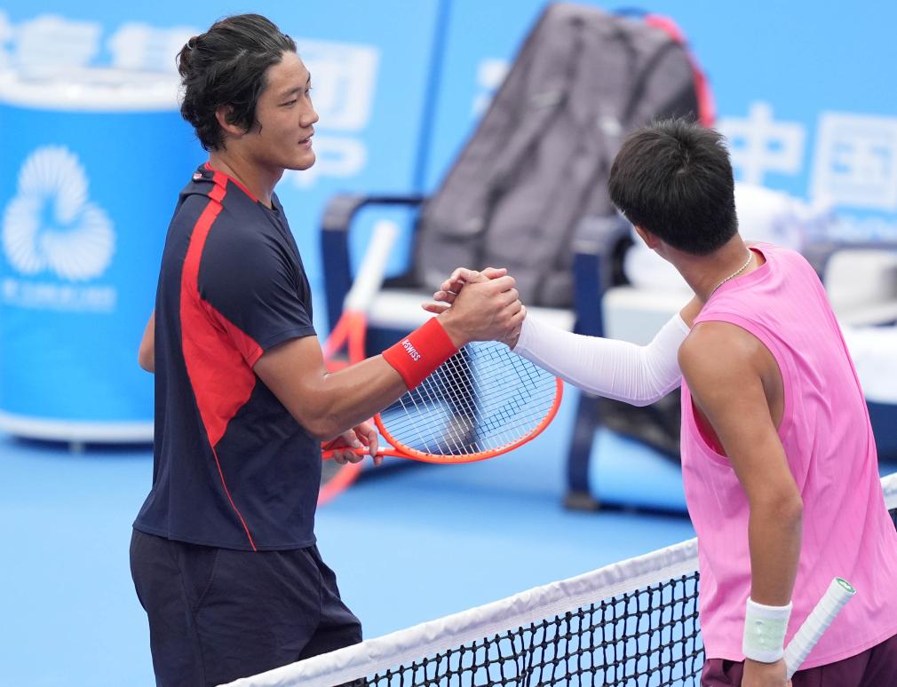 11月13日,上海隊選手張之臻(左)與湖南隊選手周洺舟在賽後握手致意。新華社記者 顏麟蘊 攝