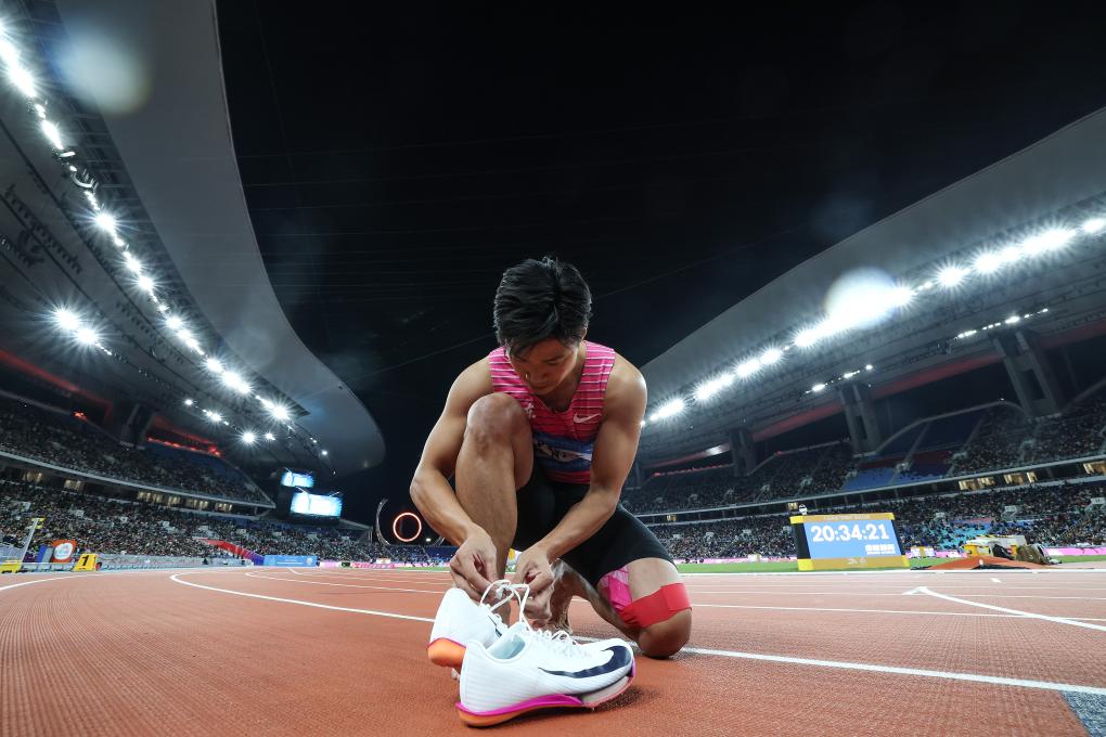 11月20日,廣東隊選手蘇炳添在男子4X100米接力決賽後脫下跑鞋。新華社記者 黃偉 攝