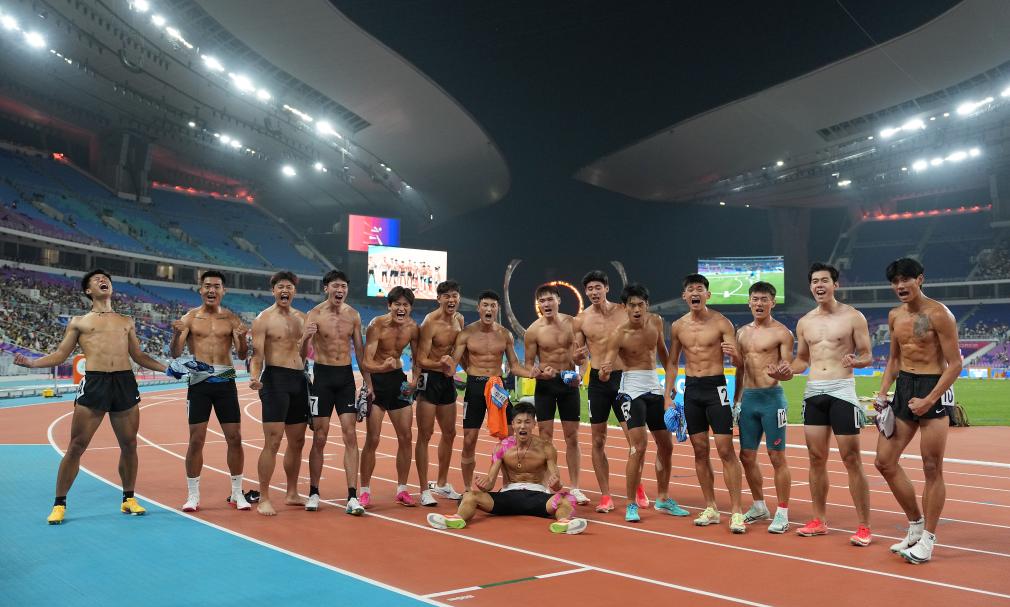 11月16日,選手們在田徑男子十項全能1500米比賽後脫去上衣慶祝。新華社記者 江漢 攝