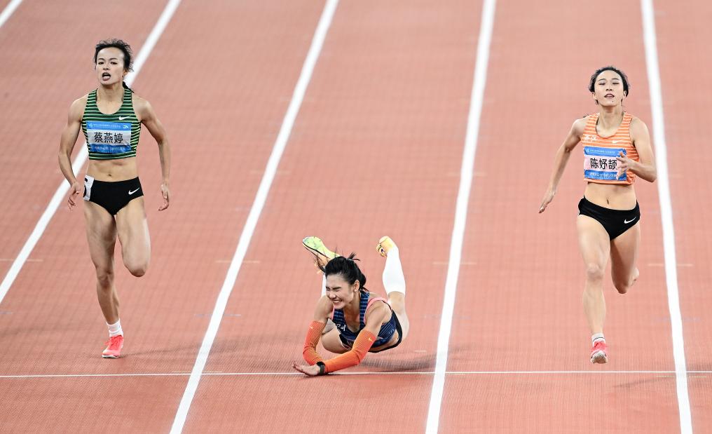 11月19日,四川隊選手劉英蘭(中)在女子200米決賽中摔倒。 新華社記者 鄧華 攝
