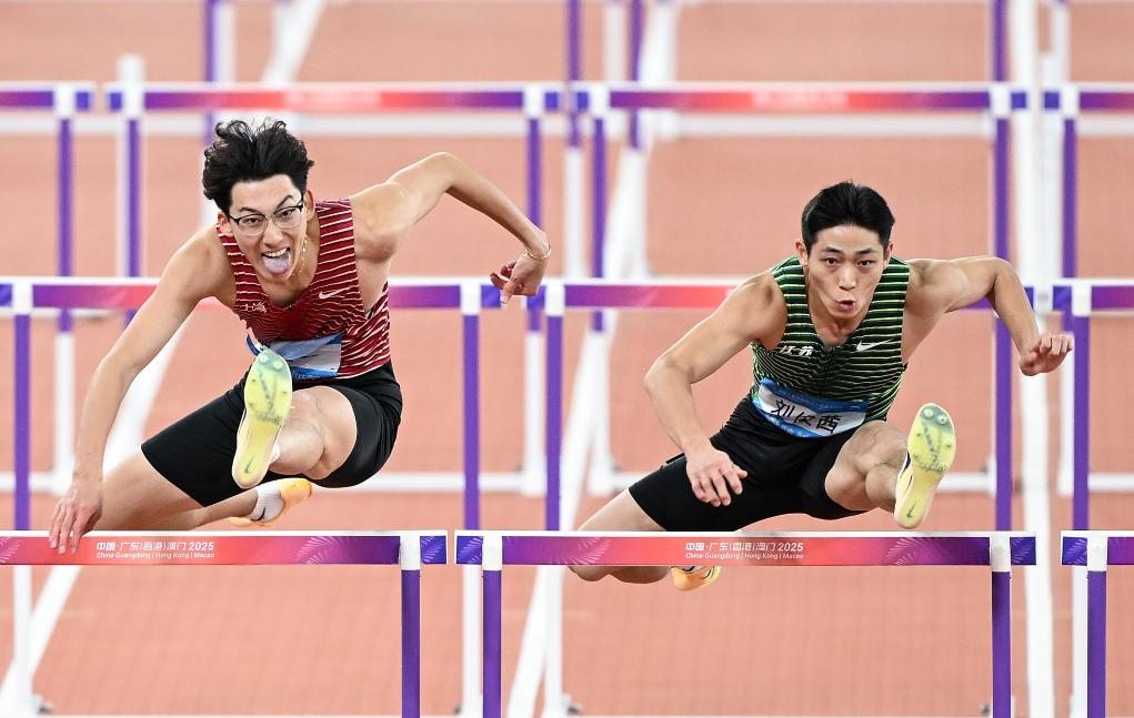 11月19日,上海隊選手徐卓一(左)、江蘇隊選手劉俊茜(右)在男子110米欄決賽中。他們分獲冠、亞軍。 新華社記者 鄧華 攝