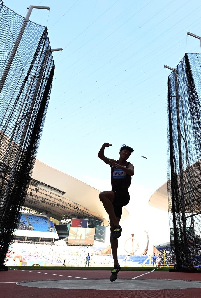 11月16日,遼寧隊選手陳俊屹在男子十項全能鐵餅比賽中。新華社記者 江漢 攝