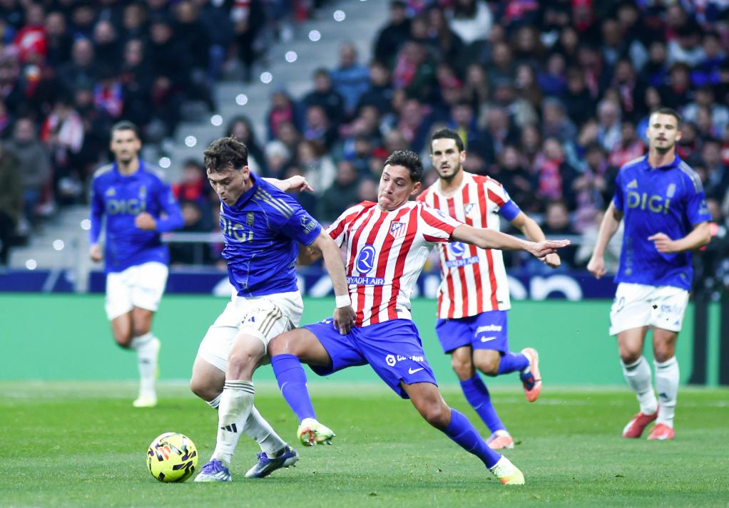 11月29日,馬德里競技隊球員莫利納(右三)與皇家奧維耶多隊球員費德里科·維納斯(左二)在比賽中拼搶。 當日,在2025-2026賽季西班牙足球甲級聯賽第14輪比賽中,馬德里競技隊主場2比0戰勝皇家奧維耶多隊。新華社發(古斯塔沃·巴連特攝)