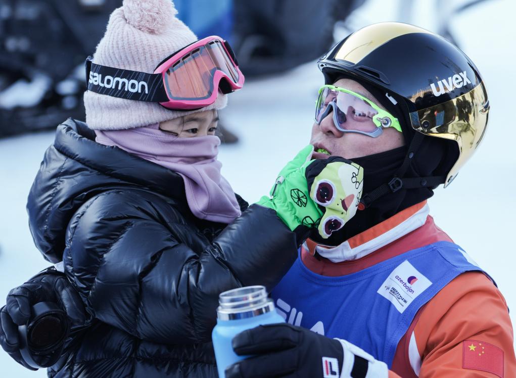 12月20日,中國自由式滑雪運動員齊廣璞(右)的女兒在賽後為他摘下護臉。最終,齊廣璞獲得男子個人項目銀牌。新華社記者 盧星吉 攝
