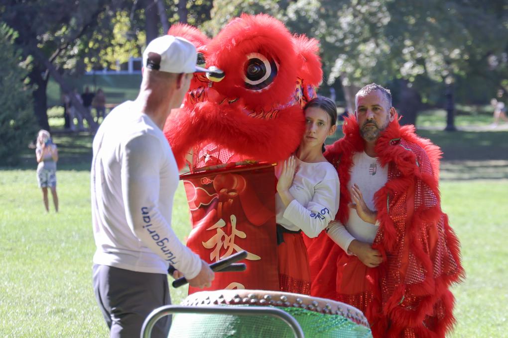 ↑9月21日,在匈牙利首都布達佩斯,匈牙利舞獅協會主席、禪武聯盟副主席桑多爾·米凱斯(左)指導舞獅表演,16歲的高中女生勞拉·薩拉蒙(中)和搭檔認真聆聽。新華社發(弗爾季·奧蒂洛攝)