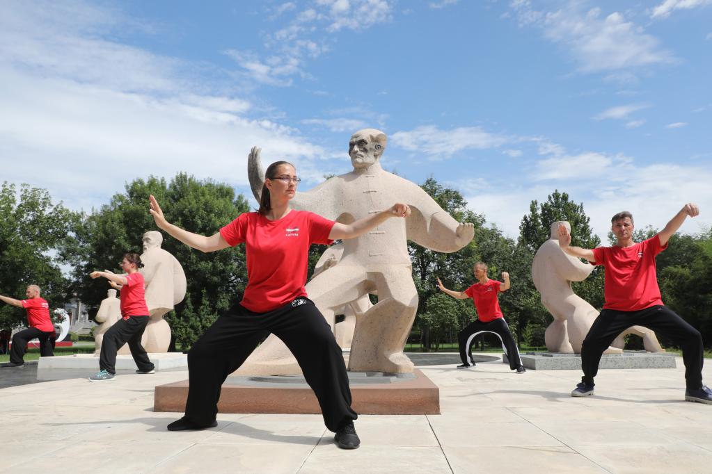 ↑8月16日,拉脫維亞學員在河南焦作市中國太極拳博物館前練習太極單劍。新華社發(徐宏星攝)