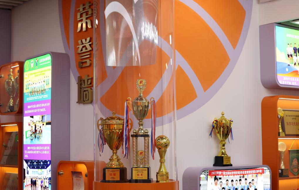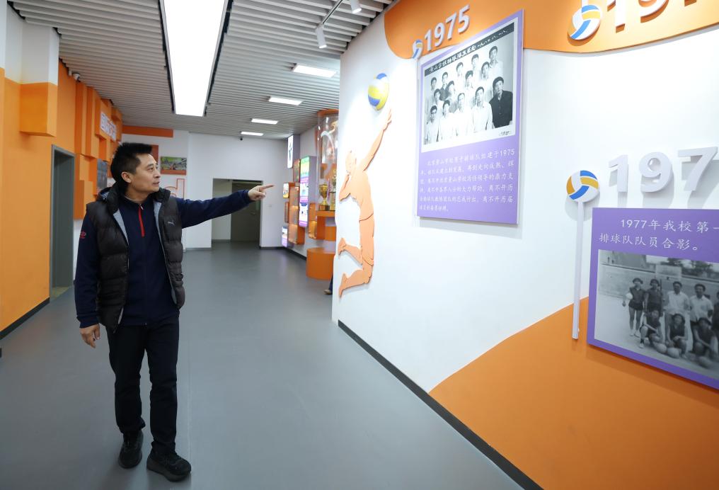 ↑北京景山學校排球訓練館內“攀峰”墻報