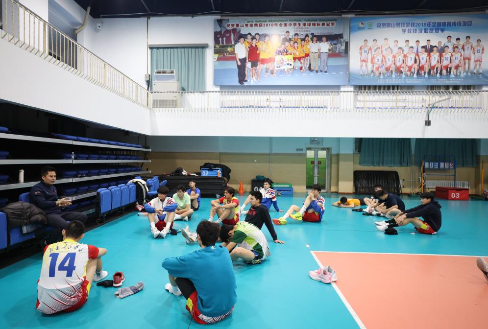 ↑北京景山學校排球隊球員在訓練後聆聽主教練李峰(左一)總結