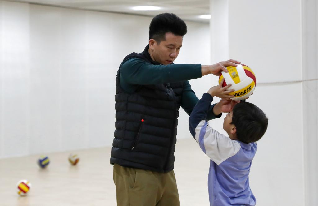 ↑北京景山學校排球隊小學組主教練尹曉光(左)在訓練中指導球員