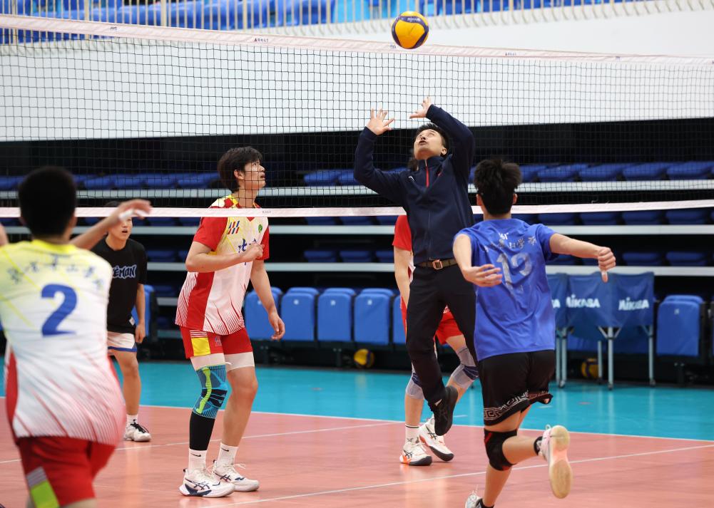 ↑北京景山學校排球隊主教練李峰(右二)與球員們一起打訓練賽