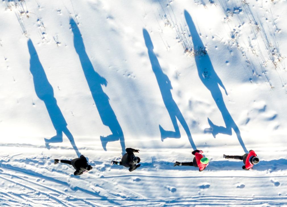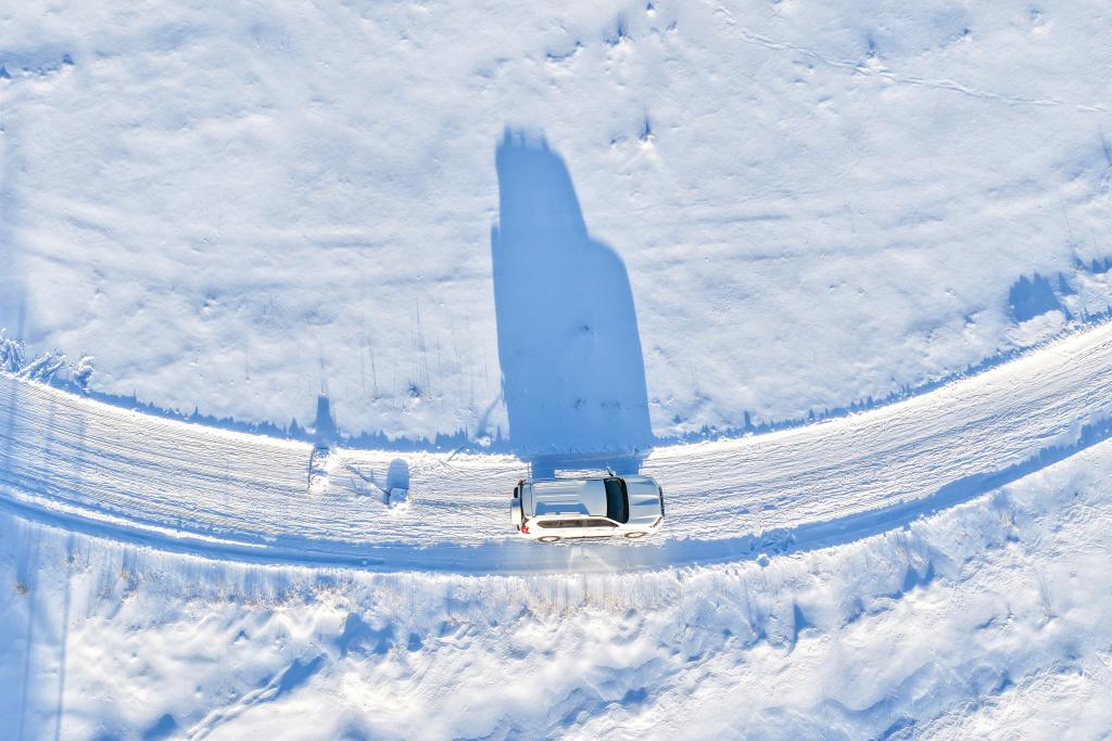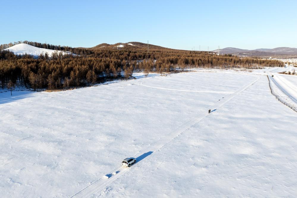 1月14日,在根河市北郊的一處滑雪場,劉斯衛駕駛車輛拉着暖氣片壓雪道(無人機照片)。新華社記者 連振 攝