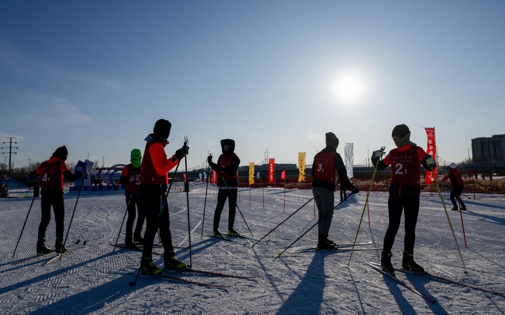 1月14日,在根河市北郊的一處滑雪場,隊員們準備進行越野滑雪訓練。新華社記者 連振 攝