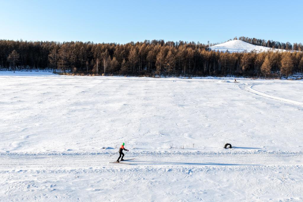 1月14日,在根河市北郊的一處滑雪場,隊員娜木娜在進行越野滑雪訓練(無人機照片)。新華社記者 連振 攝