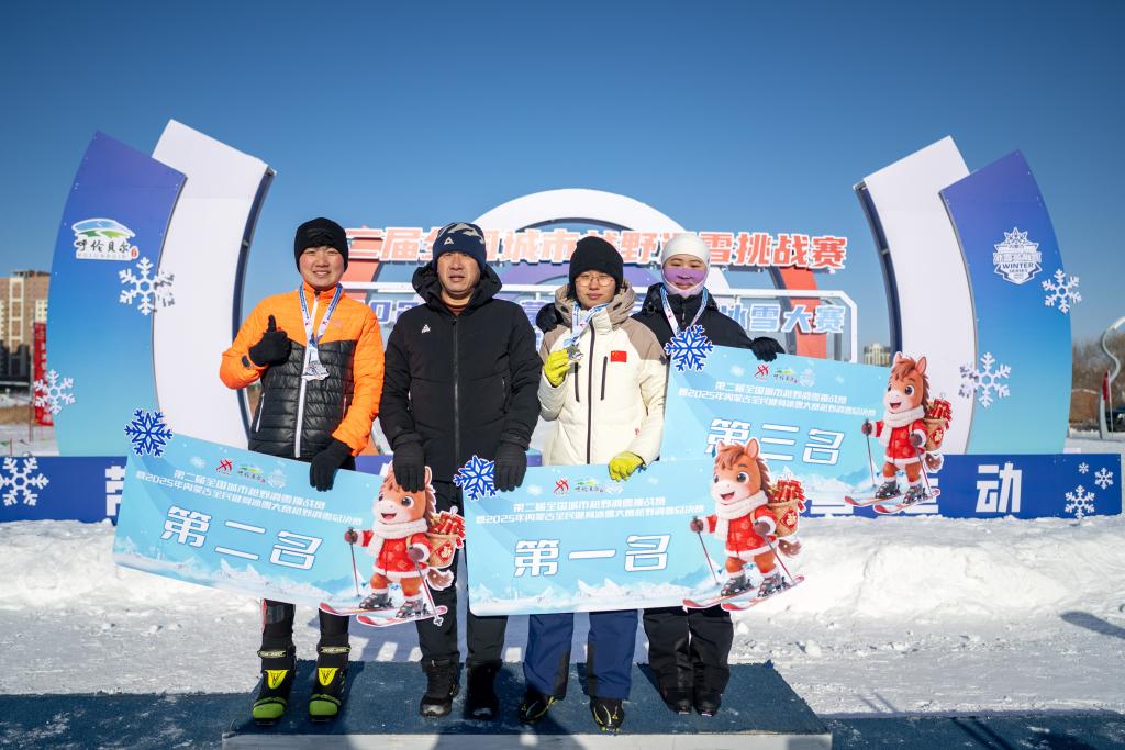 1月17日,在呼倫貝爾海拉爾舉辦的第二屆全國城市越野滑雪挑戰賽上,陳春洋(左三)、宗美玲(左一)和教練劉斯衛(左二)在頒獎儀式上合影。新華社記者 連振 攝