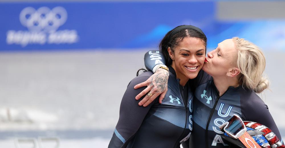 2022年2月19日,美國選手凱莉·漢弗萊斯(右)和隊友凱莎·洛夫在北京冬奧會女子雙人雪車比賽後。新華社記者 姚劍鋒 攝