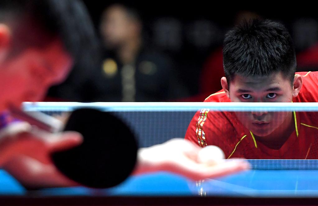 在河南新鄉市舉行的2021“直通WTT大滿貫·世乒賽”暨奧運模擬賽男子單打四分之一決賽中,林詩棟(右)在比賽中準備接樊振東的發球。新華社記者 李安 攝