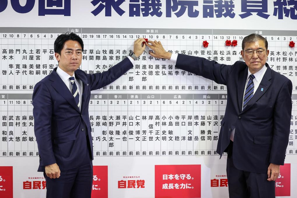10月27日,在日本東京自民黨總部,日本首相、自民黨總裁石破茂(右)和前環境大臣小泉進次郎將象徵成功當選的紅花貼在候選人名字上。新華社發(Pool圖片,青山隆史攝)