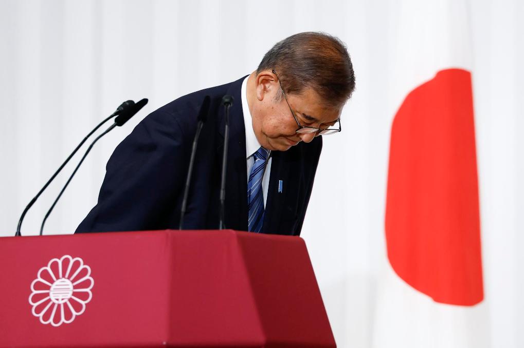 10月28日,在日本東京自民黨總部,日本首相、自民黨總裁石破茂結束在記者會上的講話後向&上議員鞠躬。新華社發(Pool圖片,金敬勳攝)