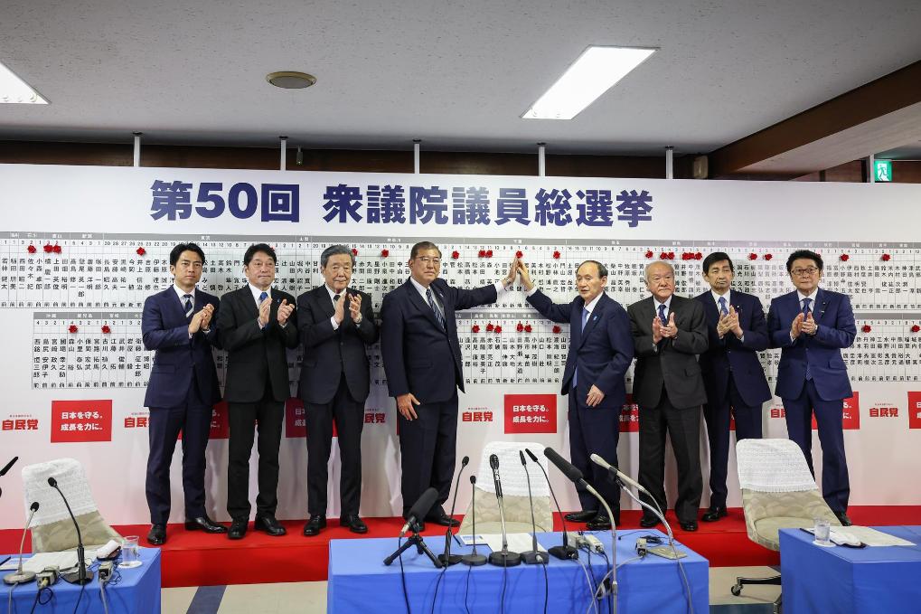 10月27日,在日本東京自民黨總部,日本首相、自民黨總裁石破茂(左四)和其他自民黨成員一同將象徵成功當選的紅花貼在候選人名字上。新華社發(Pool圖片,青山隆史攝)