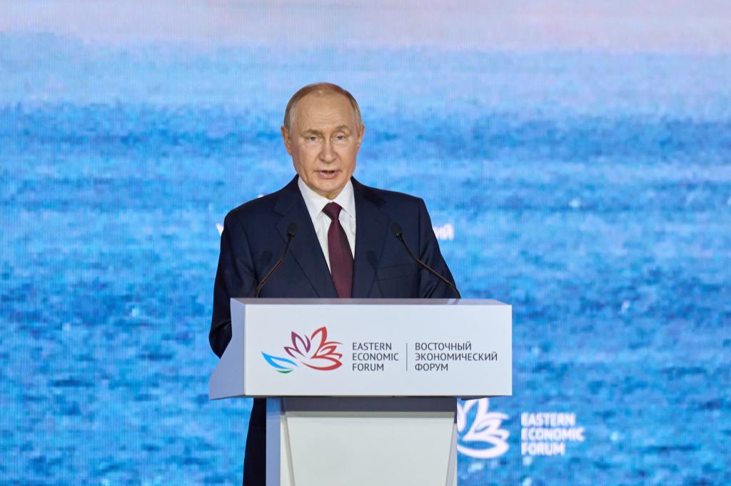9月5日,俄羅斯總統普京在符拉迪沃斯托克出席第十屆東方經濟論壇全體會議時發表講話。新華社發(郭飛洲攝)