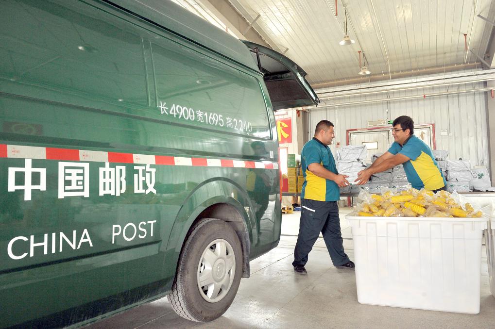 新疆葉城郵政員工麥麥提艾力·吾布力(左)與艾尼瓦爾·阿迪力在該縣宗朗鄉九麟甄選合作社裝運糯玉米。封裝、打包、貼單……郵車開進農産品加工企業,第一時間將十多種農産品發往全國各地。近年來,新疆郵政分公司“郵企合作”解決了農産品“運輸難、銷路窄”的痛點,帶動了當地種植戶的收益增長,形成“企業增效、農戶增收、産業發展”的良性循環(9月10日攝)。