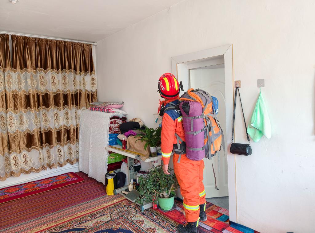 12月4日,新疆阿合奇縣消防救援人員在庫蘭薩日克鄉吉勒得斯村入戶進行探查。新華社發