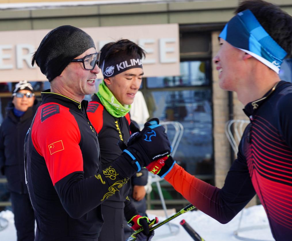 買依爾別克·赤合斯(左一)與西藏隊選手貢松朗加、黑龍江隊選手畢禹新(右一)在2025年全國滑雪登山錦標賽後握手致意(2025年12月15日攝)。