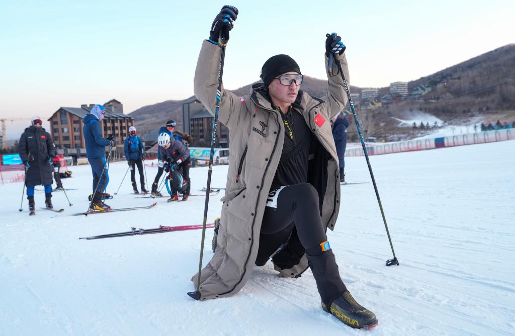 在吉林省吉林市中旅松花湖度假區,買依爾別克·赤合斯在2025年全國滑雪登山錦標賽垂直競速比賽前熱身(2025年12月15日攝)。