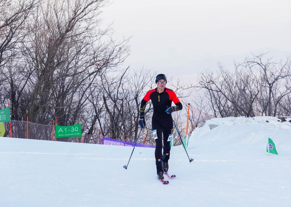 買依爾別克·赤合斯在吉林省吉林市舉辦的2025年全國滑雪登山錦標賽中準備衝線(2025年12月15日攝)。