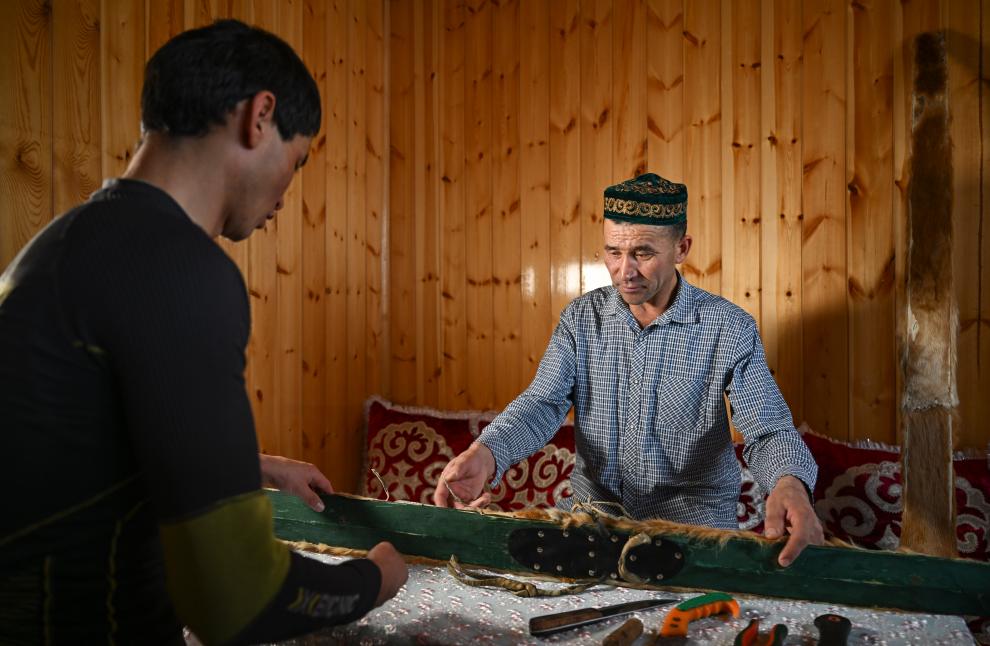 買依爾別克·赤合斯(左)和父親在位於可可托海鎮的家中維修一副古老毛皮滑雪板(2022年12月22日攝)。