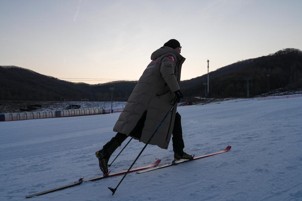 買依爾別克·赤合斯在2025年全國滑雪登山錦標賽比賽後(2025年12月15日攝)。