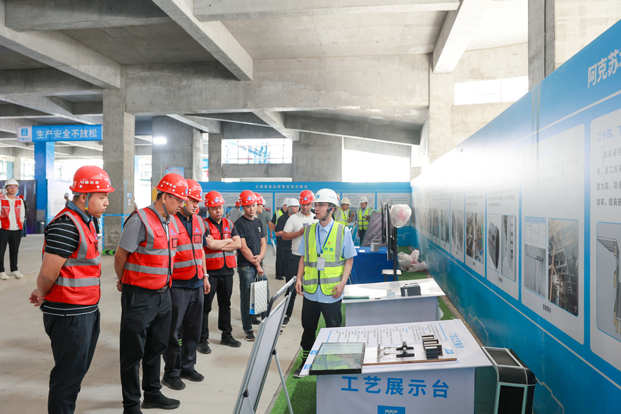 觀摩會現場共設置了5大區域。安全體驗區、紅色工地展區、新材料應用展區、智能機器人展區、小型工器具展區、機電安裝展區、實體質量展區、科技技術管理展區、BIM+裝配式展區、“四新”技術應用等,總面積達8500多平方米,多角度、全方面展示了中建新疆建工在精益建造、數字建造、綠色建造、裝配式建造的先進技術,在科技創新、安全生産上取得的優異的成果,以及在工程建設當中的應用成效。